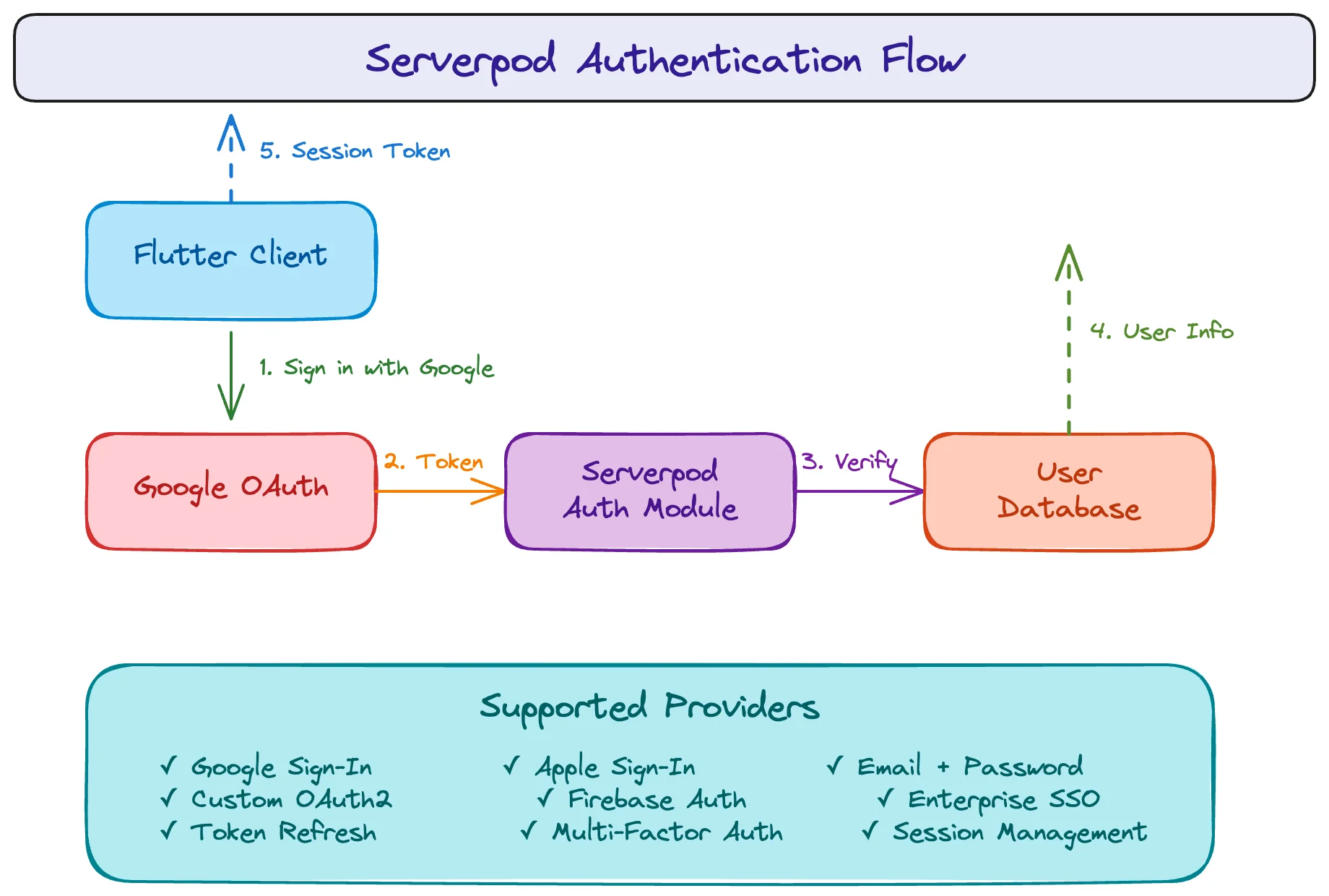 Serverpod includes serverpod_auth module with support for Google, Apple, and Email authentication.