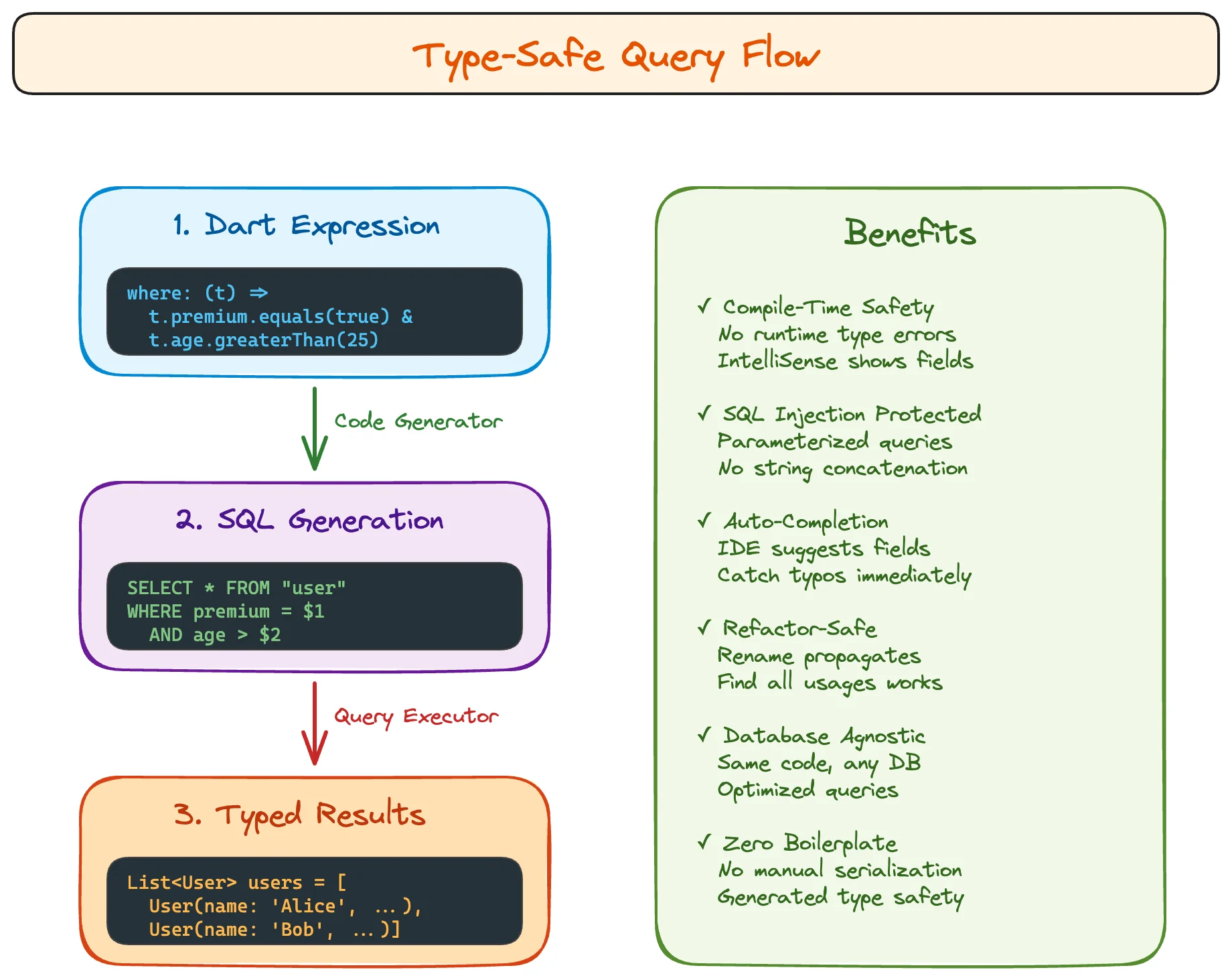Type-safe. No string column names. No SQL injection possible. IntelliSense shows available fields.