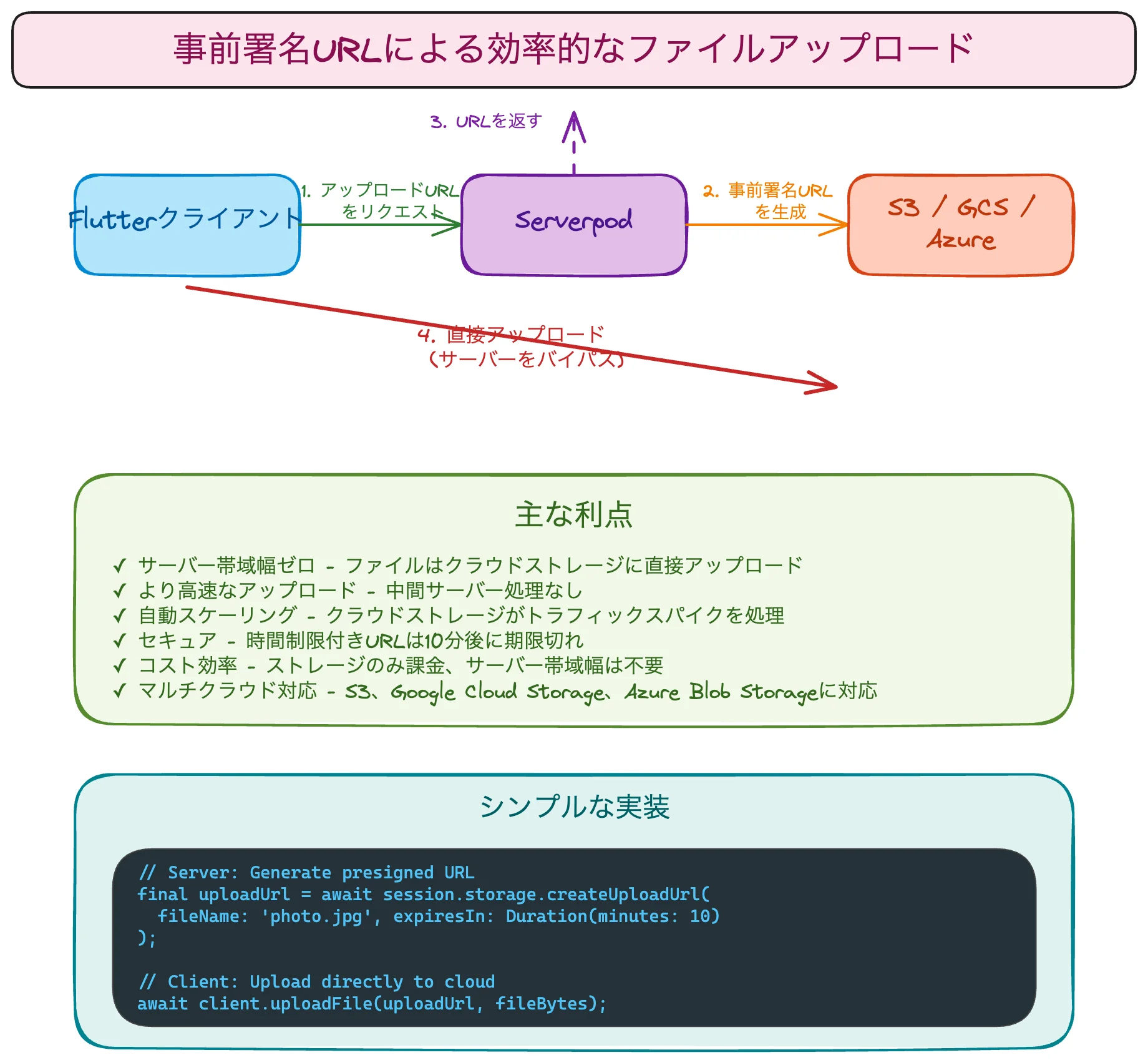 これにより、直接クラウドストレージアップロード用の事前署名されたURLが生成されます。サーバーを通過するファイルデータはありません。S3とGoogle Cloud Storageをサポートしています。