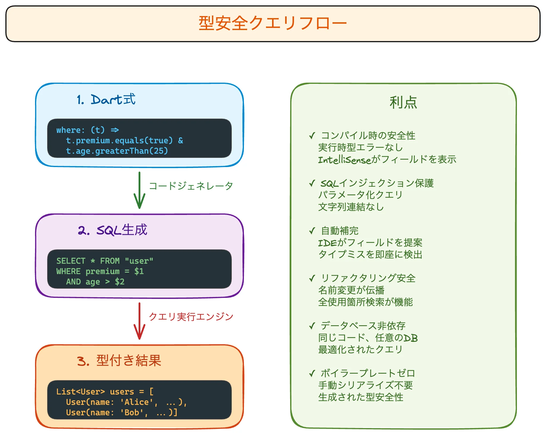 where: (t) => t.nonExistentField.equals(true) // コンパイルエラー!
