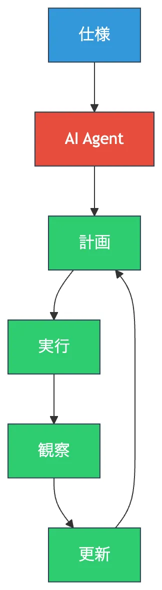 このループは、AI研究では ReAct(Reasoning + Acting)や Reflexion といったアーキテクチャとして定式化されています。 単発の応答ではなく、環境からのフィードバックを受け取りながら行動を更新し続ける仕組みです。
