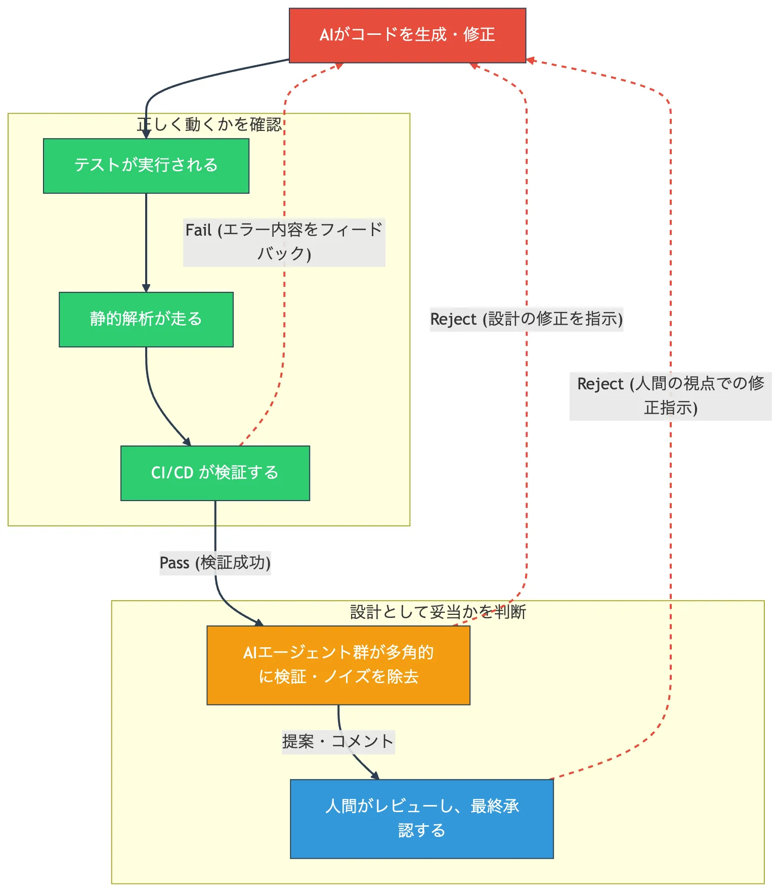 継続的インテグレーションと自動テストは、もともと人間のミスを防ぐために作られました。しかしこれは同時に、AIへの委譲を安全にするガードレールでもあります。一度テストやCIで弾かれたとしても、エラーログというフィードバックを返すことでAIは自らコードを修正し、再提出します。