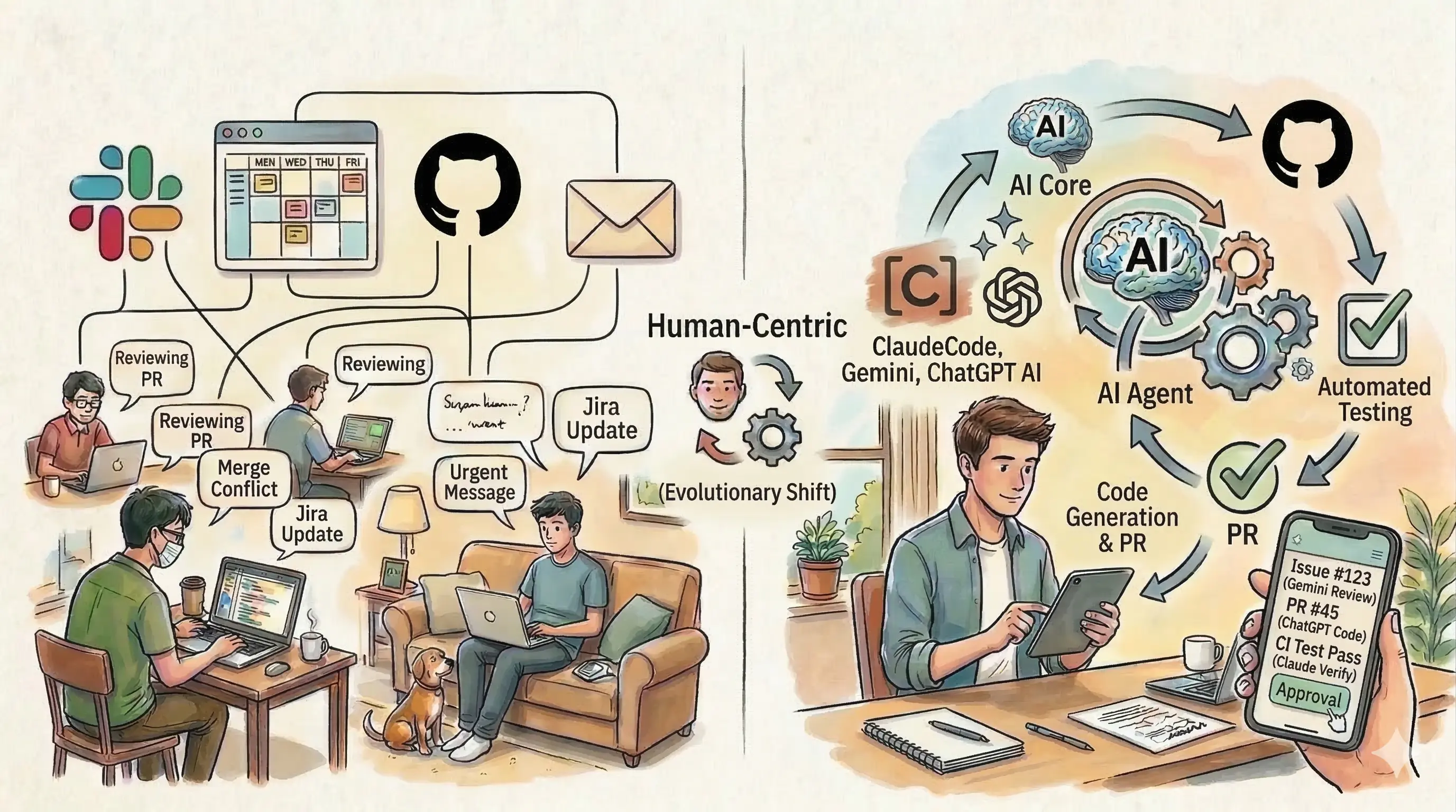 従来のリモートワークでは、「どこで働くか」が変わりました。人がオフィスから分散し、自宅やカフェで仕事をするようになりました。一方で、実行の主体はあくまで人間のままでした。